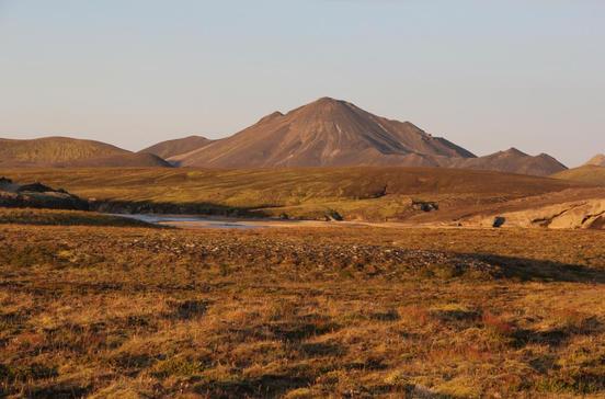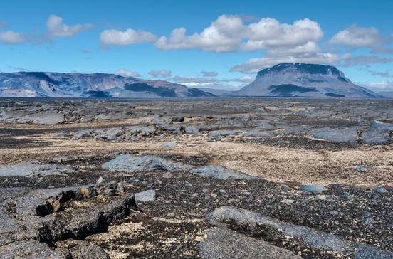Ódáðahraun ist Islands größte Lavawüste mit einer Gesamtfläche von 4500 km2.5000 Jahre alte Lava, Sand, Schotter und einige monolithisch aufragende Tafelberge aus Palagonit prägen ihr Gesicht: schwarz und abschreckend, trostlos und trocken. In dem losen und porösen Gestein vulkanischen Ursprungs versickern die Niederschläge so schnell, dass keine Pflanze die Feuchtigkeit nutzen kann. Nur an den Rändern der Lavawüste, wo das Grundwasser in kleinen Quellen austritt, bilden sich grüne und fruchtbare Oasen wie Herðubreiðarlindir.