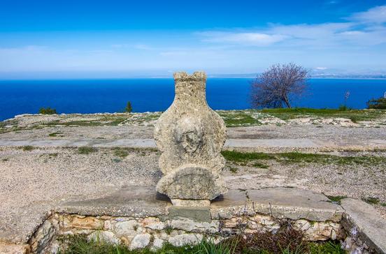 Auf dem Gipfelplateau eines 255 m hohen Hügels, von Kerýneia aus Richtung Südwesten, legten Archäologen 1928/29 die Reste eines Palasts frei, der von etwa 500-380 v.Chr. bewohnt war. Über drei Ebenen waren 140 Räume und eine Thermalbadeanlage verteilt. Wer hier residierte, weiß man allerdings nicht.