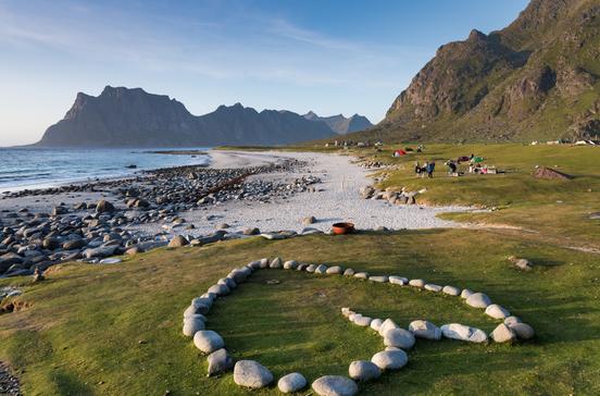 Egal, ob du dich einfach in die Sonne legen, ein Picknick machen oder mutig ins kühle Nass springen möchtest: Dieser 8 km außerhalb von Henningsvær an der Gabelung der E10 mit der Fv816 gelegene Strand ist der perfekte Ort für einen entspannten Nordland- Sommersonnengenusstag.