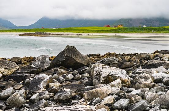 Weiß wie Schnee zieht sich dieser Traumstrand bei Flakstad über mehrere Kilometer und bis zu mehreren Hundert Meter Breite, gesäumt von Felsen und Dünenkliffs, fast bis Ramberg hin. Ständig rollen vom offenen Ozean Brandungswellen heran, und Gischtwolken steigen auf, in denen Möwen oft zu Hunderten schweben.