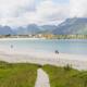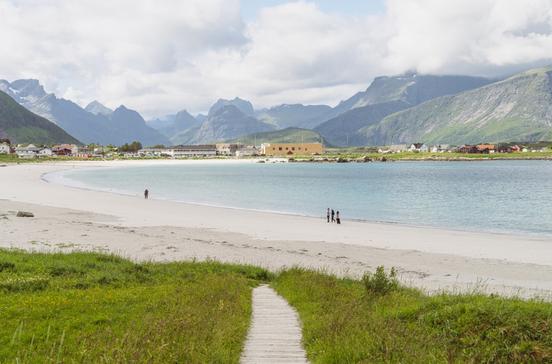 Gäbe es ein „Norwegen sucht den Superstrand“ hätte der feinsandige Ramberstrand gute Chancen. Bis in den Juni/Juli hinein sind die Berge im Rücken des Strandes, der sich halbmondförmig auf gut 1 km Länge vor der Kulisse der kleinen Inselmetropole Ramberg hinzieht, oft noch schneebedeckt Bergen im Rücken – ein phänomenaler Anblick.