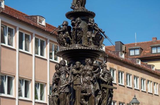 Nahe der Kirche St. Lorenz symbolisiert der Brunnen von Benedikt Wurzelbauer (1589) die Grundlagen der Nürnberger Stadtverfassung.
