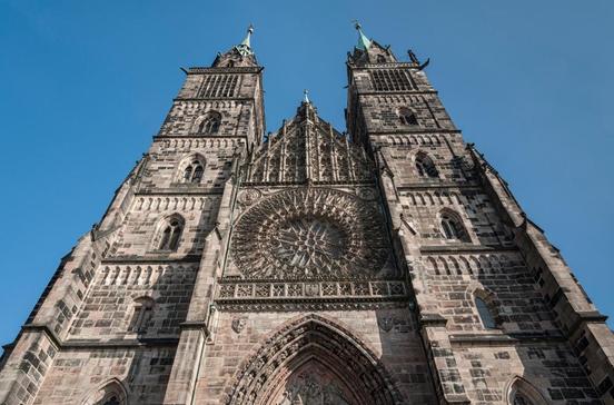 Im Inneren der doppeltürmigen Kirche (um 1250) mit der großen Fensterrose scheint Maria mit dem Engel in einem Heiligenschein aus Engeln und Rosenblüten zu schwebe – der „Englische Gruß“ (1518) von Veit Stoß (1447–1533) ist ein weltberühmtes Werk der Spätgotik. Wie ein Baum reckt sich das ebenso bedeutende Sakramentshaus empor (1496). Es wird von drei Figuren gestützt, in einer hat sich der Künstler Adam Kraft (1460–1509) mit Hammer und Meißel kniend selbst dargestellt.