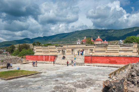 Nicht nur Fotografen sind hingerissen von der geometrischen Gestaltung der Architektur im 43 km von Oaxaca entfernten Mitla (12 000 Ew.). Im Palast der Säulen (Palacio de las Columnas) tragen die Wände der Patios und Räume einen Fassadenschmuck, der durch Licht und Schatten seine Schönheit offenbart. Annähernd 100 000 Ziegel haben mixtekische Künstler mosaikartig behauen und zahlreiche Rauten- und Mäandermuster geschaffen. Mitla bedeutet „Ort der Toten“, selbst in den leider geplünderten kreuzförmigen Königsgräbern schmückte man die Wände auf diese Art.