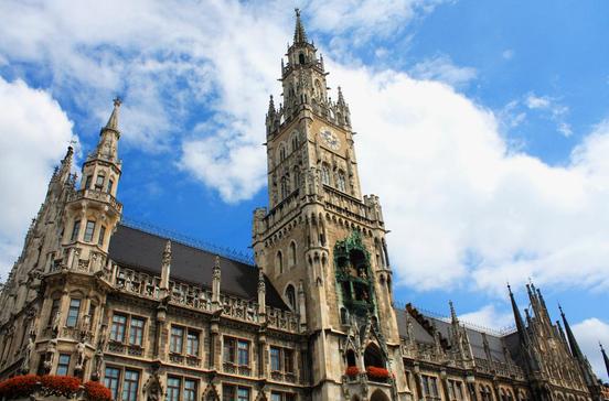 Überbordende Lust zur Gotik trieb den Grazer Architekten Georg von Hauberrisser zu seltsamen Einfällen, als das Gebäude von 1867 bis 1908 errichtet wurde. Unterhalb des 80 m hohen Turms ist das viertgrößte Glockenspiel Europas installiert. Es erzählt täglich von zwei Großereignissen, die auf dem Marienplatz stattgefunden haben: das Turnier anlässlich der Hochzeit Herzog Wilhelms V. von Bayern mit Renata von Lothringen (1568) und der heute noch am Fasching in siebenjährigem Rhythmus zelebrierte Schäfflertanz. Der Geschichte nach waren es die Schäffler (Fassmacher), die während der Pestepidemie 1517 die Münchner mit ihrem Zunfttanz aus ihren Häusern holten und somit das brachliegende Stadtleben wieder in Gang brachten.