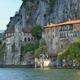 Im Jahr 1170 geriet der Kaufmann Albertus Besozzi bei einem Sturm in Seenot. Erschwor der hl. Caterina von Alexandrien, im Fall seiner Rettung fortan zu ihren Ehren als Ere mit zu leben. Tatsächlich zog er sich danach in eine Felshöhle zurück. Bald wurde er von der Bevölkerung als Heiliger verehrt. Seine sterblichen Überreste– ein aus Holz nach gebildetes Skelett sowie die restlichen echten Knochen– können besichtigt werden. Rund um die Grotte entstand ein Kloster, das wie ein Schwalbennest am Felsen klebt. Selbst jenen, die mit Religion nichts am Huthaben, verschlägt der atemraubende Blick über den See die Sprache. Imposant ist auch die alte Traubenpresse, mit der die Mönche einst die Erträge ihrer Güter verarbeiteten.