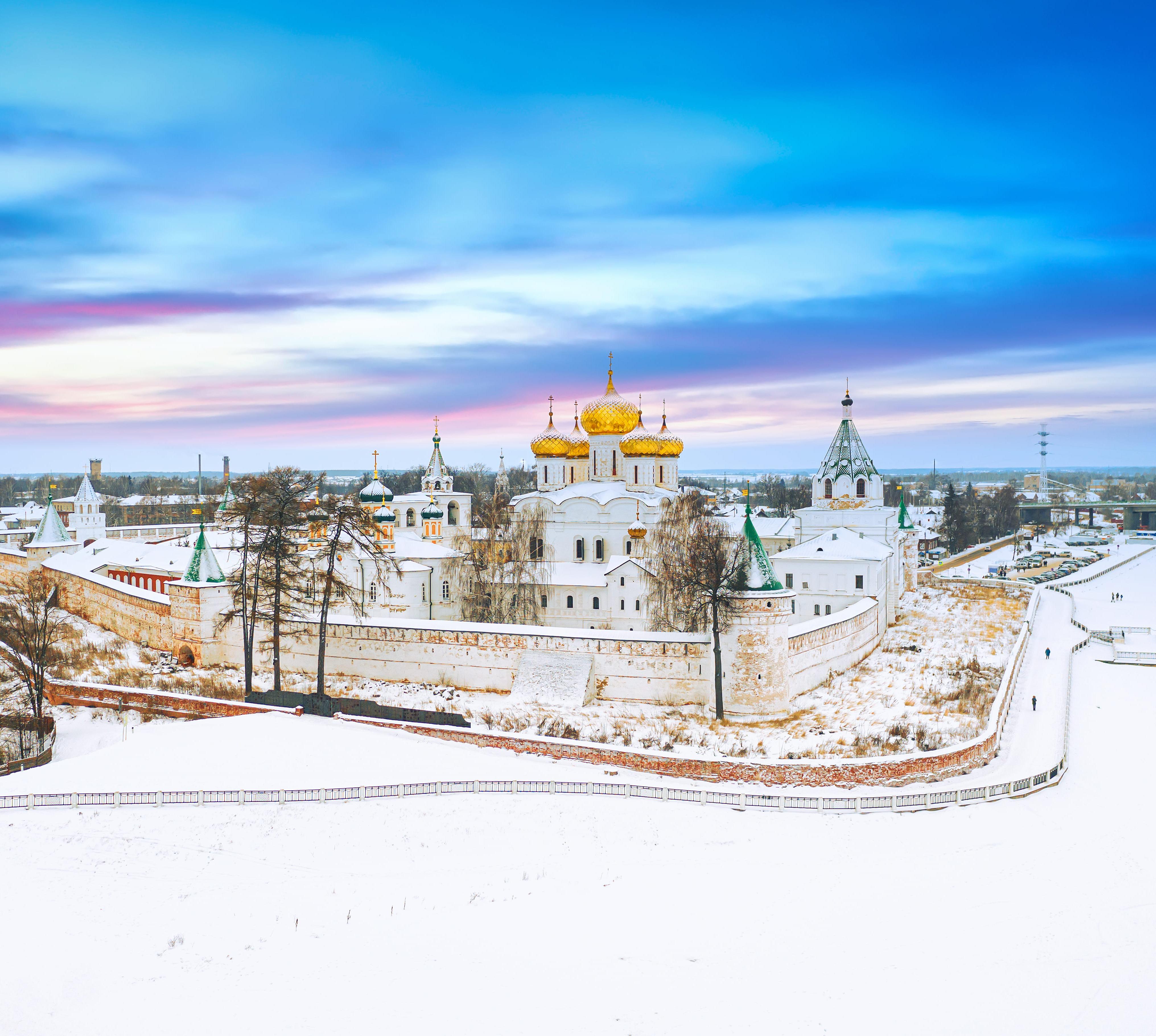 Das bedeutendste Bauensemble der Stadt ist das zu Ehren des Märtyrers Ipatios errichtete Kloster, dessen Bau im 13.Jh. begonnen wurde. Die Anlage ist reich an Legenden. So soll der Tatarenfürst Tschet auf dem Weg nach Moskau erkrankt sein. Im Traum erschienen ihm die Jungfrau Maria und der hl. Ipatios (auch Ipatjew), die ihm Heilung versprachen, sollte er zum Christentum übertreten. So tat er es, wurde gerettet und stiftete aus Dankbarkeit ein Kloster. Historisch verbürgt ist, dass sich der junge Michail Romanow, ehe er Zar wurde, hier mit seiner Mutter, der Nonne Marfa, vor den eindringenden Polen versteckte. Als er 1613 dem Ruf nach Moskau folgte, wurde das Kloster dem Schutz der Romanows unterstellt, ausgebaut und gefördert. Das Klosterensemble gliedert sich in die Altstadt und die kaum bebaute Neustadt. Die Dreifaltigkeitskathedrale (1650–52) mit fünf goldenen Kuppeln ist das prachtvollste Bauwerk. Der Innenraum ist in mehreren Reihen bis zur Decke mit restaurierten Fresken geschmückt, die aus dem Leben Christi, der Heiligen sowie der Geschichte der Rus berichten. Auch die Darstellung des Tatarenfürsten Tschet ist nicht vergessen. Neben dem wuchtigen Bau erhebt sich der Glockenturm, von dem um 12 Uhr weit ins Land klingende A- und Cis- Töne erschallen. Neben den Zellen der Mönche und dem Erzbischöflichen Palast kann auch das Romanow- Palais mit den Gemächern des ersten Vertreters aus der Dynastie der Romanows (bis 1917) besucht werden.