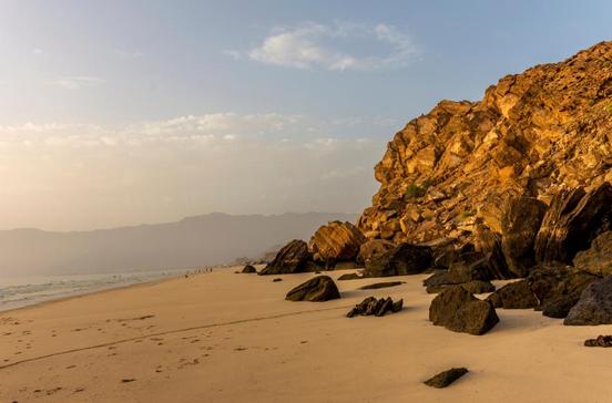Bereits die Fahrt zur großen Bucht von Fazayah ca. 80 km westlich von Salalah macht Laune, denn die Strecke führt am Strand von Mughsail vorbei zu den Haarnadelkurven an den Flanken des Wadi Afawl und weiter auf die Höhen des Jebel Qamar. Dort oben fühlt man sich ein bisschen wie der Ausguck im Mast eines Segelschiffs: Meeresbrise und ungetrübter Blick bis zum Horizont, nur sind da eben auch noch die steilen Felsklippen mit ihren bizarren Formationen. Eine steile, aber gute Piste führt hinab zu mehreren kleinen und großen Buchten mit feinen Sandstränden, wo du eigentlich spontan campen kannst – oder auch geplant: Decke und Kissen im Hotel leihen (aber wiederbringen!) und im Restaurant oder Supermarkt ein paar Leckereien zum Naschen mitnehmen.