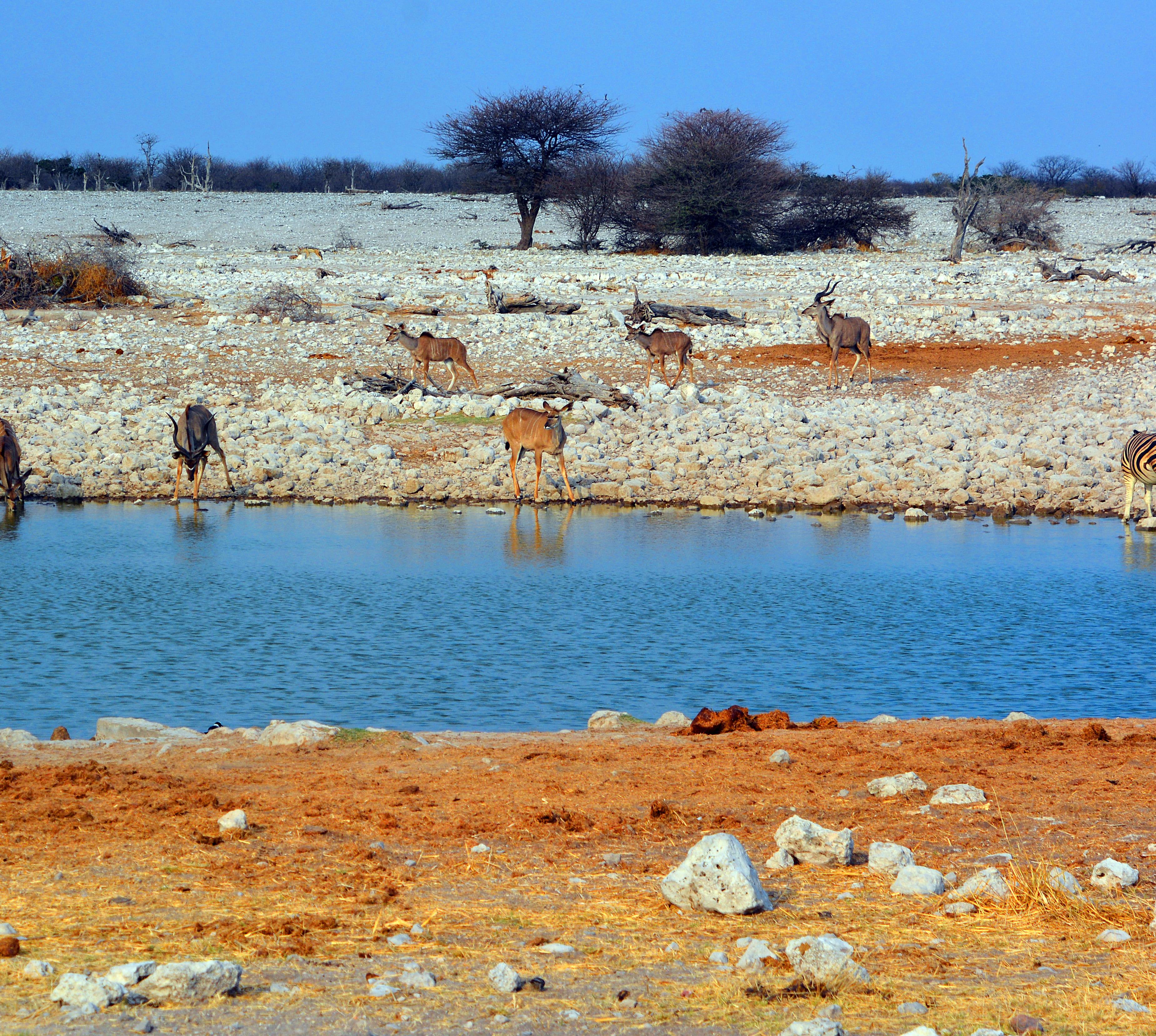 In einer meterhohen Staubwolke tobt eine Herde Gnus durch den Etosha National Park. Ein paar Springböcke stieben mit ihren typischen Hüpfern davon, nur knapp 500 m weiter liegt ein Rudel Löwen im hohen Gras, das gigantischen Zebraherden als Weide dient. In der anschließenden Dornstrauchsavanne ragen Dutzende Giraffenhälse in den Himmel – das ist Wildnis wie aus dem Bilderbuch. Der Nationalpark, der bereits 1907 gegründet wurde, ist Namibias berühmtester und mit 22 912 km2 einer der größten in Afrika. Wer die Möglichkeit hat, genießt die Ruhe, die hier in der Nebensaison herrscht. Von Juli bis November geht es im Etosha National Park relativ geschäftig zu. Dann weichst du am besten in den ruhigeren Nordosten des Parks aus. Nahe dem King Nehale Gate sind auch die Chancen am größten, Elefanten zu sichten. Mit dem eigenen Mietwagen bist du hier gut unterwegs, Parkkarten gibt es an den Rezeptionen in den Camps zu kaufen.