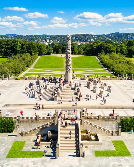 Oslo ist Norwegens einzige Großstadt, dennoch ist von Hektik nichts zu spüren. Verkehr gibt es zwar auch hier reichlich, Läden und Straßenmusiker sorgen für Beschallung, ein paar Skater schlängeln sich an Passanten vorbei. Doch niemand flucht oder regt sich auf. Vor Restaurants und Cafés stehen ein paar Tische, die bei jedem Wetter dank Heizlampen und Wolldecken gut besetzt sind. Alles wirkt gemächlich. Norwegern ist es fremd, ihren Unmut mit Rufen oder Hupkonzerten kundzutun. Diese zurückhaltende Attitüde prägt auch das Hauptstadtleben. Die Architektur unterstreicht dies, überall sind die Häuserschluchten aufgebrochen: Statistisch gesehen haben 95 Prozent der Stadtbevölkerung im Umkreis von 300 m eine Grünanlage. Die vielen Parks und Plätze der Stadt sind dazu da, zu bummeln oder sich auf eine Bank zu setzen, um dem Treiben entspannt zuzusehen. Und es ist sicher kein Zufall, dass der Mittelpunkt Oslos nicht der Hauptbahnhof ist oder das Schloss, sondern die Grünanlage Studenterlunden zwischen Parlament und Nationaltheater. Der einstige Campus, ein rechteckiger Park mit lauter Bänken, ist Oslos Treffpunkt schlechthin. Im Winter ist hier eine Eisbahn angelegt, die nicht nur bei den Jugendlichen der Hauptstadt gut ankommt.