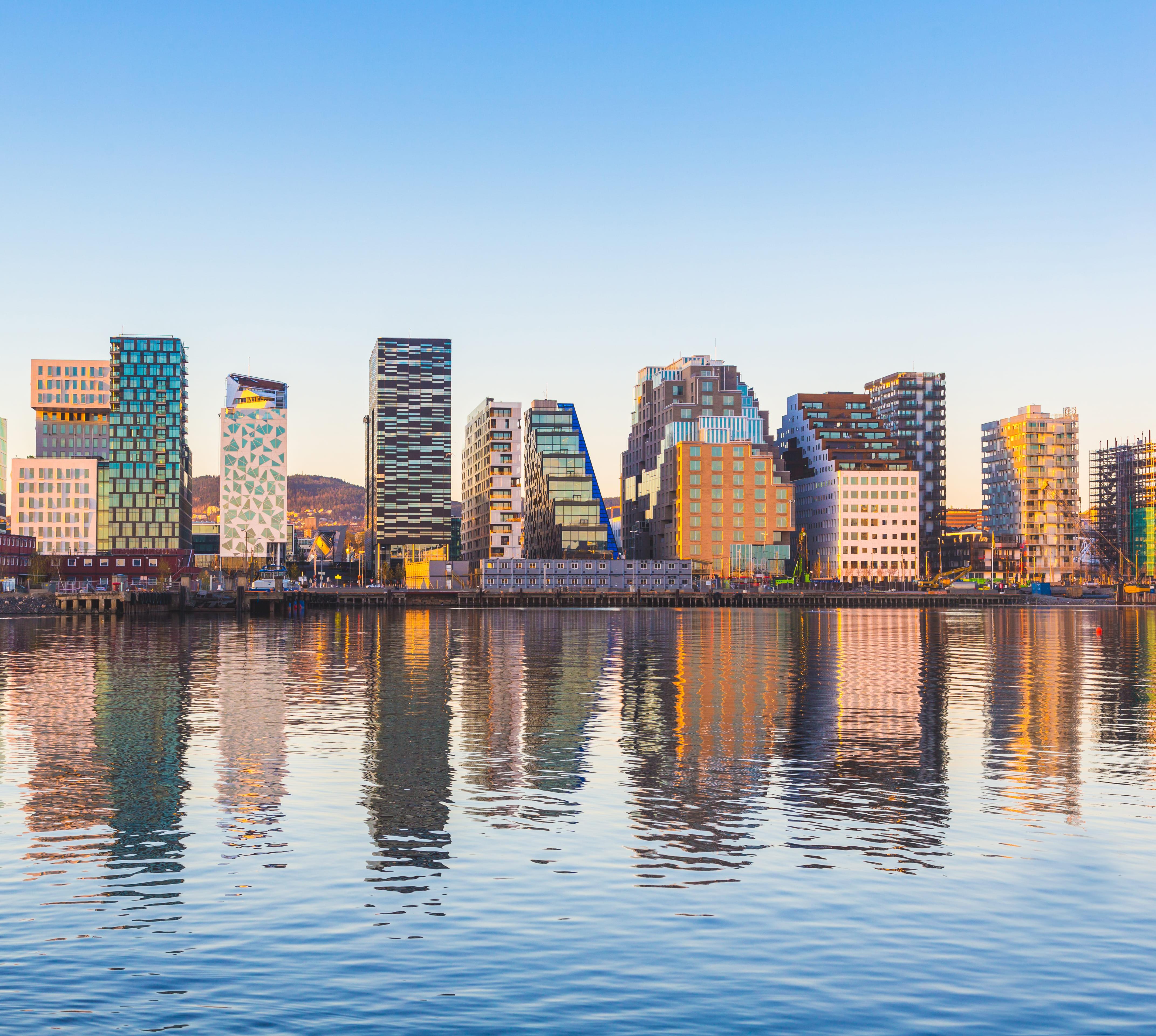 Oslos Skyline befindet sich im ständigen Wandel, und noch ist der Prozess nicht abgeschlossen. Zu dem im Sonnenlicht funkelnden Opernhaus ist das neue Munchmuseum ebenso hinzugekommen wie das neue Nationalmuseum in unmittelbarer Nachbarschaft zu den viereckigen Türmen des ziegelroten Rathauses. Zwischen der Flaniermeile Aker Brygge und Tjuvholmen setzt das Dach des Astrup-Fearnley-Museums als neue Landmarke aus Holz und Glas seine Segel. Spätestens, wenn auf dem Gelände des früheren Containerhafens die neuen Wohnviertel Sørenga und Bjørvika mit Kanälen, Kaianlagen und Badebuchten vollendet sind, könnte Oslo zu einer wirklichen Metropole werden. Das Sørenga Sjøbad ist schon jetzt großer Anziehungspunkt im Sommer – im urbanen Seebad wird mit Blick auf Fjord, Barcode-Viertel und Kreuzfahrtschiffe in der Sonne geaalt und sich anschließend abgekühlt.