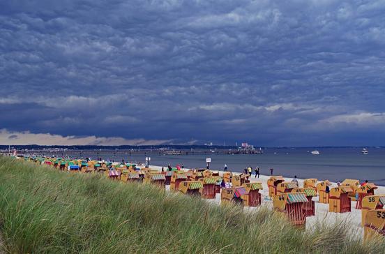 Der feinsandige, flache und ca. 4,5 km lange Strand beschreibt einen sanften breiten Bogen zwischen Nordermole und dem steinreichen Brodtener Ufer (FKK- und Hundestrand). In der Saison steht hier ein Strandkorb neben dem anderen.