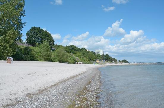 Zu diesem Strand fahren die Kieler im Sommer. Der breite Sandstrand ist kurtaxenfrei und in der Badesaison bewacht.