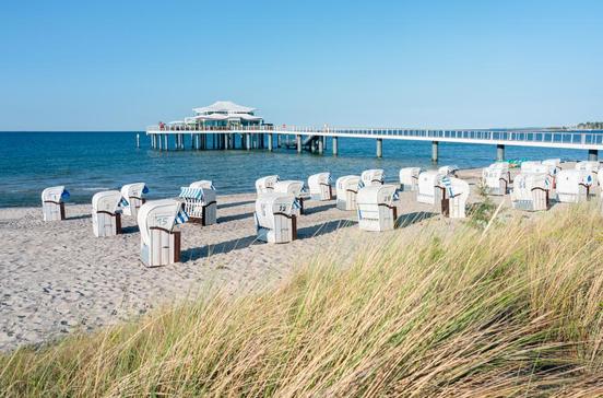 Strand, der 6 km lang, steinlos und flach abfallend ist. Zuerst begegnet man FKK-Badenden, dahinter schließt sich der Hundestrand an. Je weiter du dich der Seebrücke näherst, desto lebhafter geht es zu. Der Strand ist in Themenbereiche aufgeteilt, z. B. Wellness- und Relaxstrand (Abschnitt 25, gegenüber der Strandkirche) mit Massageangeboten und Saftbar. Im Sommer wird hier auch Theater gespielt. Für Familien interessant: Gumdas Spielstrand mit Programm für 3- bis 12-Jährige. Auf der Promenade stehen Fitnessgeräte für eine kleine Workout-Einheit, auf zwei Anlagen wird Adventure-Golf gespielt.