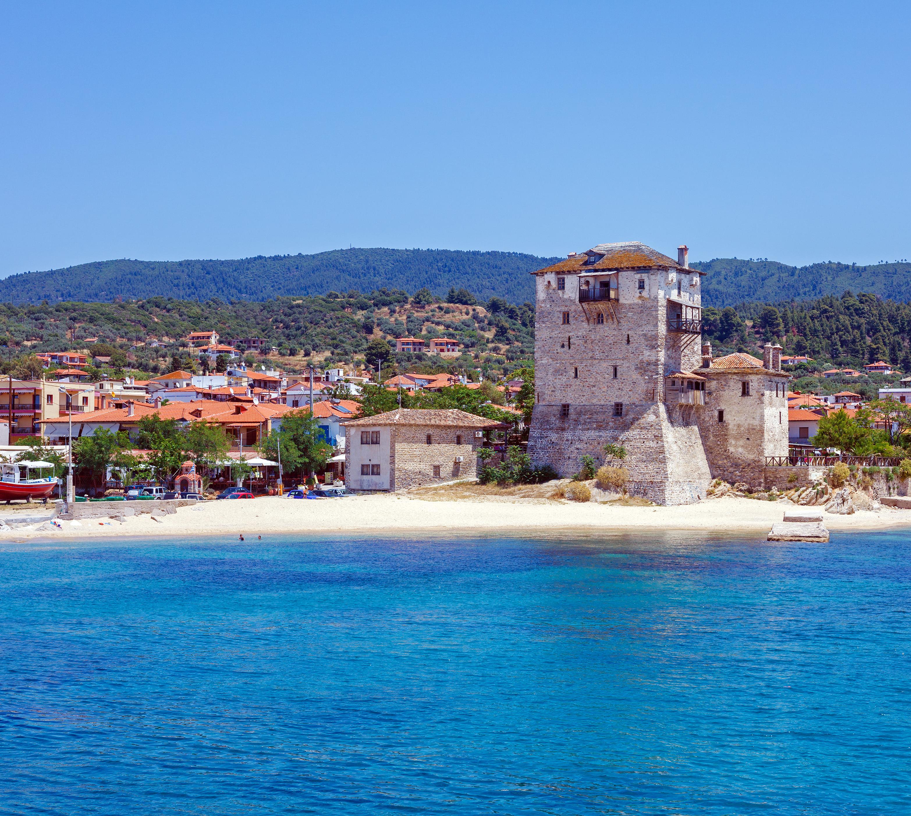 Der mächtige Wehrturm am Anleger von Ouranópoli wurde bereits 1344 erbaut. Er hatte die Aufgabe, das hier gelegene Klostergut zu schützen, die Ernten aufzunehmen und den Bewohnern bei Angriffen Unterschlupf zu bieten. Um 1850 stürzte das oberste Geschoss bei einem Erdbeben ein. Danach bekam der Turm das bis heute erhaltene Dach. Mitte der 1990er-Jahre wurde er mit EU-Geldern restauriert und birgt jetzt eine Ausstellung über das Leben auf dem Berg Áthos.