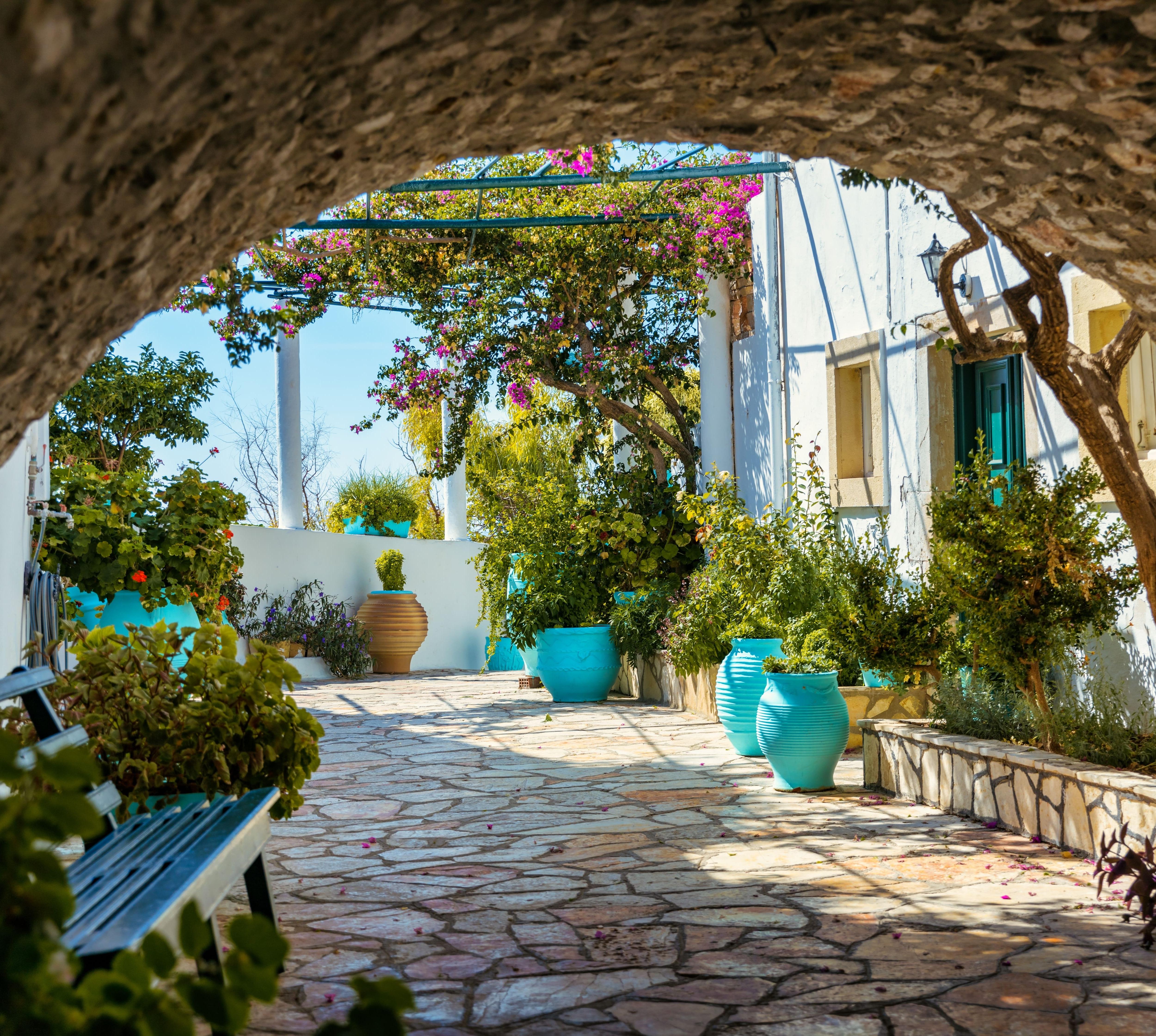 Es ist schon verrückt: Kaum einer will heute noch ins Kloster gehen. Hierher aber strömen die Menschen in Scharen. Seine fotogene Lage passt jedoch nur dann halbwegs gut aufs Bild, wenn man an Klostertaverne und -friedhof vorbei etwa fünf Minuten am Ufer entlang Richtung Norden geht. Dort erst zeigt sich, dass der weiße Konvent auf einem Kap nahe am Steilufer thront. Mit seinen schattigen Arkaden, eleganten Mauerbögen, dem blütenreichen Innenhof und den Gebäuden aus dem 18.Jh. ist das Kloster Panagía Theotókou tis Paleokastrítsas (Kloster der allheiligen Gottesgebärerin von Paleokastrítsa) ein wirklich idyllischer Ort. Bekommt man dann noch einen der drei Mönche mit aufs Bild, kann es ein richtig gutes Foto werden. In der Kirche wird man dann in Zeiten zurückversetzt, als Ereignisse nur von Malern festgehalten werden konnten. Da lohnt ein genauerer Blick auf die nur 43 x 33 cm große, schon 1653 gemalte Ikone ganz vorn an der linken Seitenwand: Da sind zunächst drei Kirchenväter, die an ihren mit Kreuzen besetzten Stolen zu erkennen sind. Darunter ist eine dramatische Szene dargestellt, die sich am Festtag dieser drei Heiligen, am 30.Januar 1653, tatsächlich in der Stadt Korfu ereignete. Ein Feuerwerkskörper, der ihnen zu Ehren gezündet werden sollte, explodierte. Eine Amme, die mit einem Kind auf dem Arm in der Nähe stand, wurde getötet, das Kind blieb wie durch ein Wunder unverletzt. Die Amme ist im rechten Teil des Bildstreifens deutlich zu sehen: Blut strömt aus ihrer Seite, sie sinkt zu Boden und hält dabei das Kind noch immer im Arm. Dessen Eltern stifteten diese Ikone als Dank an die Heiligen für dieses (halbherzige) Wunder, von dem der Text rechts vom Bildstreifen ausführlich berichtet. Zwei weitere Ikonen hängen ganz hinten an der linken und rechten Seitenwand. Sie wurden 1713 gemalt und illustrieren in jeweils vier Bildfeldern die biblische Schöpfungsgeschichte. Richtig süß-naiv sind da die Tierdarstellungen!