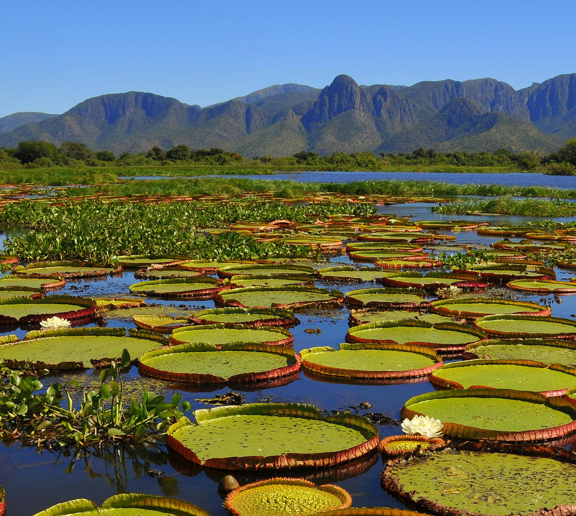 Das Pantanal ist ein Ort der Superlative: Hier leben die größten Jaguare, Papageien, Tukane, Otter, Ameisenbären und Nager (Wasserschwein) der Welt, außerdem Südamerikas schwerstes Säugetier, der Tapir und die größte Schlange, die Anaconda. Darüber hinaus sind hier Brüll- und Kapuzineraffen beheimatet, tummeln sich Unmengen von Fischen in den Flüssen, bevölkern Kaimane die Wasserstellen und sind Hunderttausende von Vögeln in diesem Überschwemmungsgebiet von der Größe Großbritanniens zu Hause oder auf Durchreise. Während der Regenzeit (Okt. bis April) saugt sich das Pantanal wie ein Schwamm mit Wasser voll. Nur die höher gelegenen Bereiche bleiben trocken, zwei Drittel der Fläche des mit 230.000 km2 größten Süßwasserüberschwemmungsgebiets der Welt stehen unter Wasser. Ab Mai sinken die Wasserstände, und der fruchtbare Boden wird zum Nahrungs- und Brutplatz für Fische und Vögel, auch für Zugvögel. In der Trockenzeit sammeln sich die Tiere in der Nähe des Wassers, und es gibt weniger Moskitos. Seit Ende des 19.Jh. gibt es die "fazendas" (Viehfarmen) und extensive Rinderzucht. Wenn die Regenzeit kommt, werden die Rinder an die höher gelegenen Dämme getrieben. Tagelang sind diese "comitivas pantaneiras" (Viehtrieb im Pantanal) dann unterwegs. Heute werden viele der Farmen auch für den Ökotourismus genutzt.