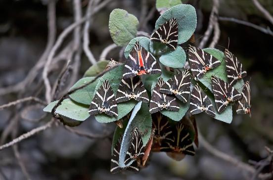 In diesem grünen, wasserreichen Garten leben im Sommer Tausende mattroter Schmetterlinge der Art Spanische Flagge (lat.: Euplagia quadripunctaria).
