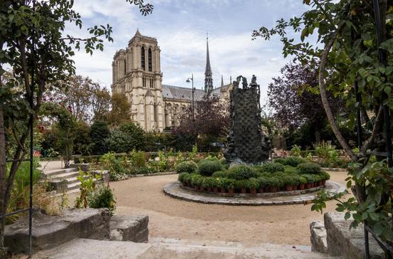 Der an eine der ältesten Kirchen der Stadt, Saint-Julien-le-Pauvre, angrenzende Park bietet einen herrlichen Blick auf die Kathedrale Notre-Dame.
