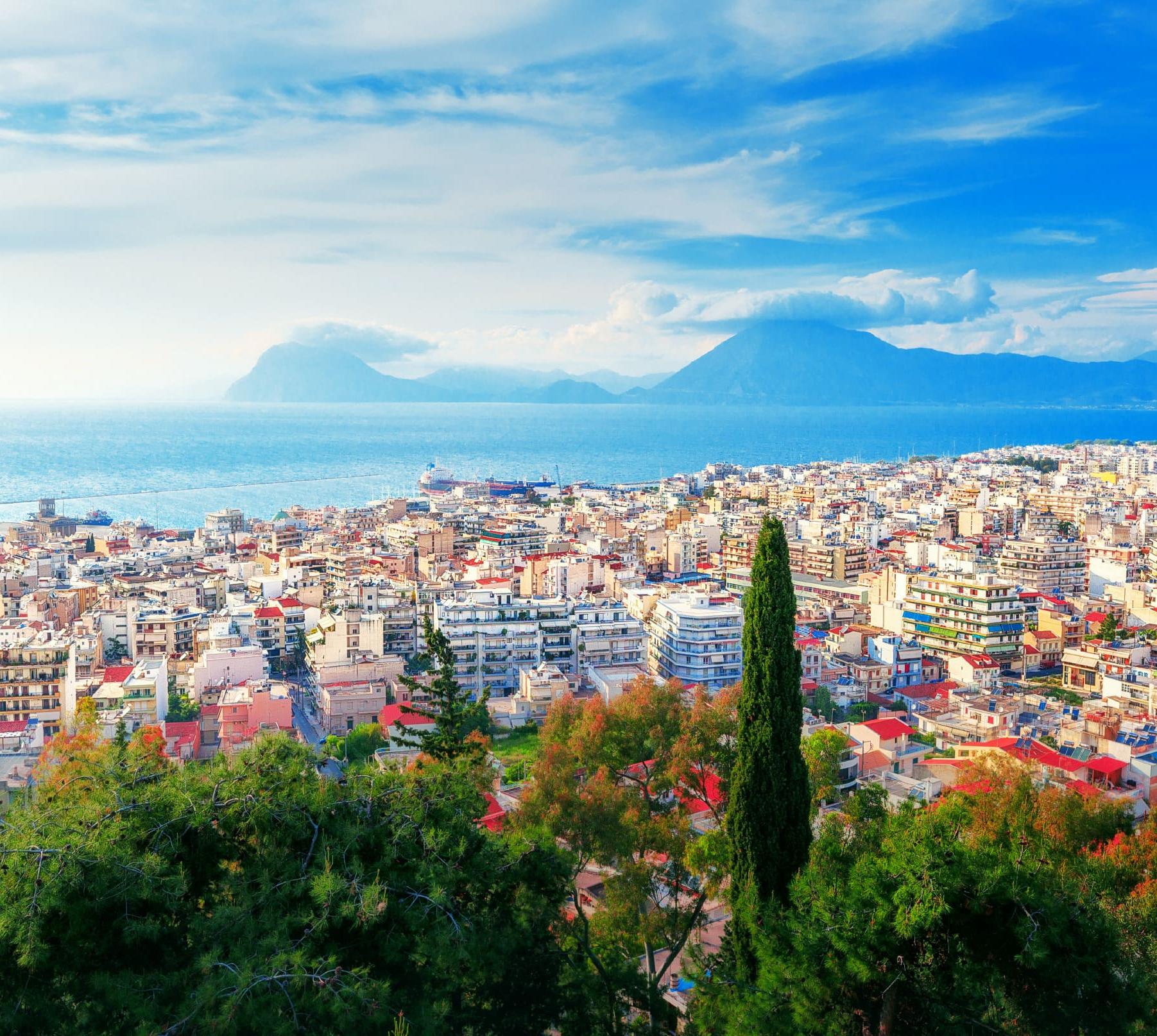 Das Tollste an Patras ist seine Lage. Griechenlands viertgrößte Stadt (215 000 Ew.) und der wichtigste Hafen im Fährverkehr mit Italien breitet sich über mehrere Hügel vor der Kulisse des fast 2000 m hohen Panachaikógebirges aus, das zwischen November und März meist schneebedeckt ist.