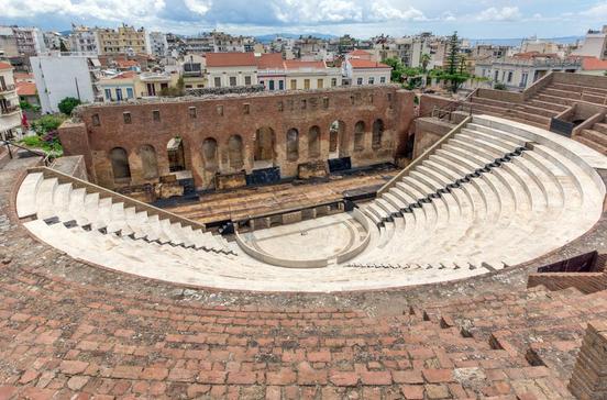Comedians gab es schon in der Antike. Damals nannten sie sich Pantomimen. Sie traten zumeist nicht in den großen Theatern, sondern in einer kleineren, überdachten Variante auf, dem Odeion. Solch ein Odeion aus römischer Zeit ist in Patras erhalten. Wie schon im Altertum wird es auch heute noch gelegentlich für Konzerte genutzt, u.a. im Rahmen eines jährlich im Juni stattfindenden Jazz-Festivals.