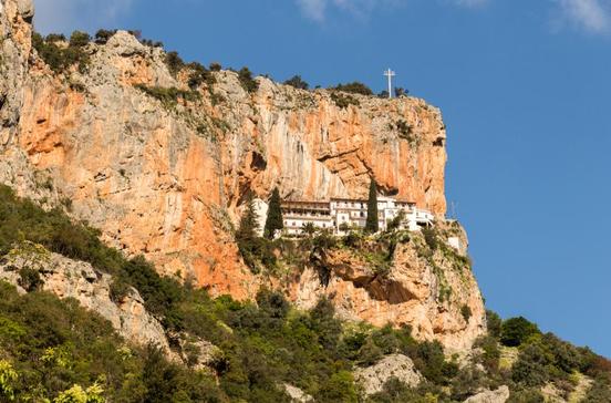 Fährt man vom knapp 100 km südöstlich gelegenen Leonídio durch die Schlucht des Flusses Dafnó ins Párnongebirge hinauf, erblickt man nach einigen Kilometern plötzlich wie ein Trugbild das blendend weiße Kloster viele Hundert Meter höher an der Steilwand eines Felsens. Kein Weg scheint hinaufzuführen – und doch ist man ein paar Kilometer weiter auf dem Parkplatz unmittelbar vor dem Kloster. Ein Fußweg führt von hier unter Felsüberhängen hindurch auf die kleine Terrasse, auf der sich Kirche und Kloster an und unter den Fels zwängen. Ist die Kirche verschlossen, läutet man die Glocke und sofort kommt eine Nonne herbei, um die Tür zu öffnen. Unter der Kirchendecke hängen zahllose Öllampen dicht an dicht, gestiftet von Gläubigen, denen ein Gebet im Kloster geholfen hat. Andere stifteten den Ikonen ein wertvolles Oklad, einen Überzug aus edlen Metallen, auf dem getrieben und ziseliert genau das dargestellt ist, was zuvor auf der Ikone gemalt zu sehen war. Besonders schön ist die Ikone Mariens als Leben spendender Quell mit großartigen Darstellungen der Kranken und Lahmen, die diesen Brunnen vor einem Kloster in Konstantinopel aufzusuchen pflegten, um geheilt zu werden.