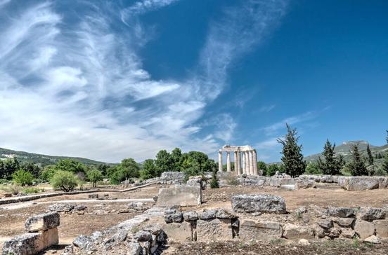 Im Vorort Alt-Korinth hat man nicht nur die Kirche mitten im Dorf gelassen, sondern auch gleich noch zwei antike Tempel und andere Bauten des Altertums. Die hat auch schon der Apostel Paulus gesehen, als er im Jahr 51 in der antiken Weltstadt war. An die dort von ihm gegründete christliche Gemeinde schrieb er auch die in die Bibel aufgenommenen Korintherbriefe. Heute ist Archéa Kórinthos nur noch ein sehr beschauliches Dorf mit grandioser Aussicht auf hohe Berge, grüne Küstenebenen und den Korinthischen Golf. Wer hier seine Peloponnes-Rundreise startet, wird fast schon zur Entschleunigung gezwungen. Das antike Korinth war bereits im 8.Jh. v. Chr. eines der bedeutendsten Gemeinwesen Griechenlands. Sein großer Vorteil war die Nähe zweier geschützter Landeplätze: am Saronischen und am Korinthischen Golf, also sowohl dem Westen als auch dem Osten der antiken Welt zugewandt. 146 v. Chr. wurde das alte Korinth von den Römern dem Erdboden gleichgemacht, weil die Korinther sich gegen Rom gestellt hatten. Deswegen sind im Ausgrabungsgelände heute auch kaum Spuren aus der griechischen Antike erhalten. Erst 100 Jahre später gründete Cäsar die Stadt neu. Als der Apostel Paulus sie ihrer großen jüdischen Gemeinde wegen im Jahr 51 oder 52 besuchte, war sie bereits wieder eine blühende Großstadt. Erdbeben in den Jahren 375 und 551 zerstörten auch sie. Archäologen haben seit 1892 das Stadtzentrum mit seinen Tempeln, Markthallen und Brunnen freigelegt. Schon auf dem Weg vom Eingang der Ausgrabungsstätte zum Museum siehst du links einen gewaltigen Felsblock mit eingearbeiteten Brunnenkammern, die Glauke-Quelle. Dahinter erheben sich die sieben noch aufrecht stehenden dorischen Säulen des Apollo-Tempels. Jede ist monolithisch, also aus einem Stück gearbeitet, und beeindruckt durch harmonische Proportionen. Ursprünglich umgaben den um 550 v. Chr. errichteten Tempel 38 solcher Säulen. Unmittelbar am Museum steht der Octavia-Tempel mit drei deutlich andersartigen Säulen. Sie sind aus Säulentrommeln zusammengesetzt und mit einem verspielten korinthischen Kapitell bekrönt. Ihnen fehlt die würdevolle Strenge der Säulen des Apollo-Tempels. Der Bau ist ja auch 600 Jahre jünger und stammt aus römischer Zeit. Besonders interessant im Archäologischen Museum sind die ausgestellten Vasen. Die Übernahme orientalischer Formen und Motive im 7.Jh. v. Chr. ist gut zu erkennen. Typisch sind die Darstellung von Tieren und Fabelwesen und die Füllung der Zwischenräume mit Ornamenten wie Blatt- und Klecksrosetten in der Zeit um 600 v. Chr. Schön sind auch die römischen Fußbodenmosaike aus dem 1./2.Jh. n. Chr. Einzigartig sind die vielen tönernen männlichen Genitalien und weiblichen Brüste in einem der fünf Museumssäle. Ähnlich wie heute noch in allen orthodoxen und manchen katholischen Kirchen wurden diese Votivtäfelchen den Göttern geweiht, wenn der Mensch Probleme mit den entsprechenden Körperteilen hatte und die Unsterblichen um Hilfe bat. Nach dem Museumsbesuch betrittst du über eine Treppe die agorá, den Marktplatz der antiken Stadt. Ihn säumten weitere Tempel, Säulenhallen mit Geschäften und öffentliche Gebäude wie Gericht und Stadtarchiv. Im Zentrum des Platzes ist eine auf die agorá vorspringende Terrasse als bema markiert. Von dieser Rednertribüne aus soll der Apostel Paulus zu den Korinthern gesprochen haben. Etwa 30 m südlich der bema begrenzte eine 165 m lange Säulenhalle den Marktplatz. Deutlich erkennbar sind 33 zweigeteilte Räume. In den vorderen sind Brunnenschächte zu sehen, die sie als Marktschenken ausweisen: In ihnen wurden Getränke kühl gehalten. Auf der gegenüberliegenden Seite der agorá führen Treppen auf die mit Marmor gepflasterte Lechaion-Straße hinunter. Sie verband das Zentrum der Stadt mit dem Hafen am Korinthischen Golf und führt heute zum Ausgang des Grabungsgeländes. Gleich rechts der Treppen sind die eindrucksvollen Überreste der schönsten Brunnenanlage Korinths zu sehen, des Peirene-Brunnens aus dem 2.Jh. Gehst du nach dem Verlassen des Grabungsgeländes zu dessen Eingang zurück, sind rechts der Straße die Reste des römischen Odeons zu sehen, eines überdachten Musiktheaters. Unterhalb davon schließen sich die Ränge des großen Theaters an, das Platz für mehr als 15 000 Zuschauer bot.