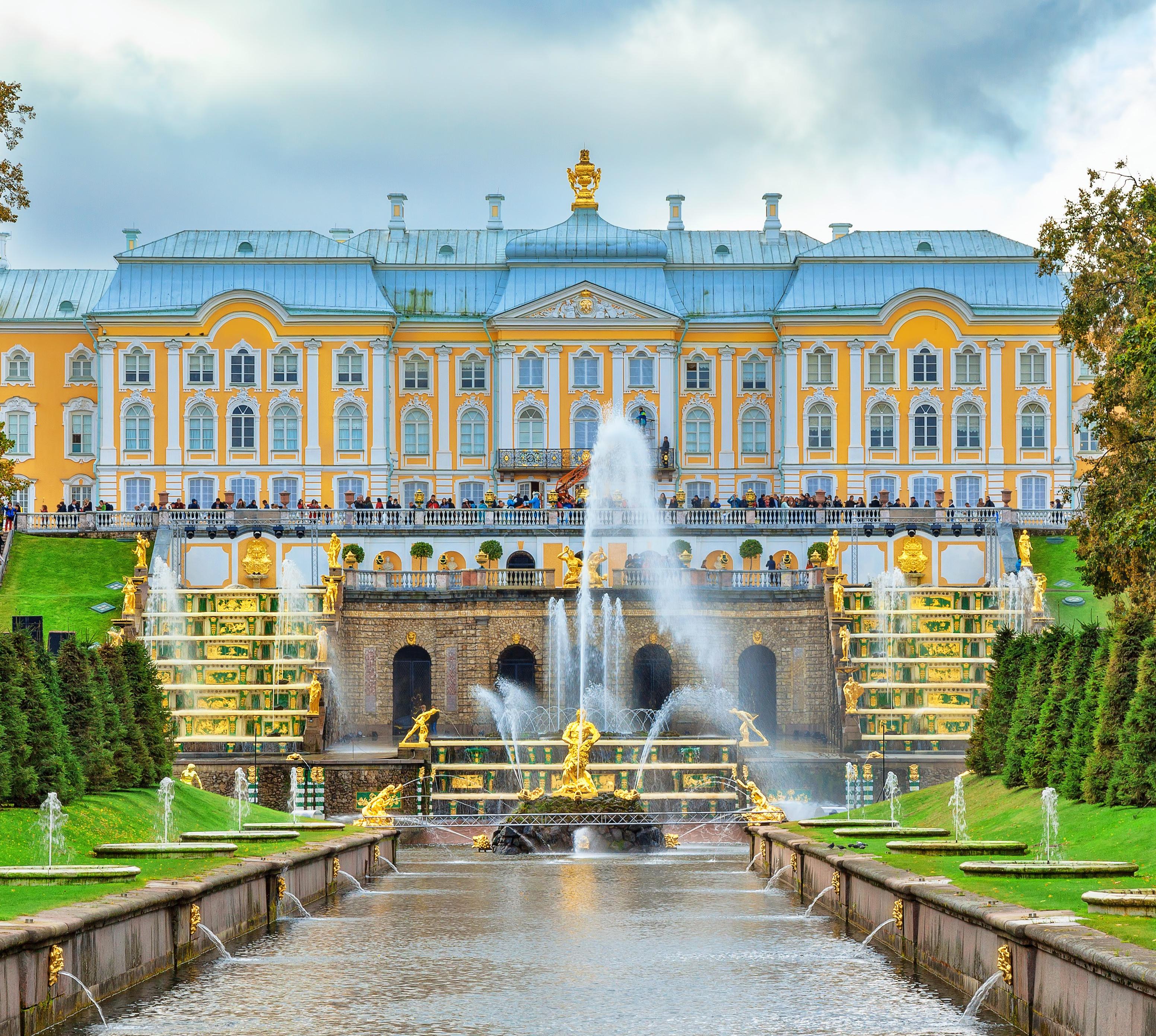 Das "russische Versailles" ist mit rund 4,5 Mio. Besuchern pro Jahr definitiv ein Touristenmagnet – und an Sommerwochenenden hoffnungslos überfüllt. Mehr noch als der Große Palast – ein 300 m langer Barockbau – ist der edle Park mit seiner Fontänenvielfalt Zeugnis für die verschwenderische Prachtentfaltung der russischen Monarchie. Peterhof wurde in seinen Grundzügen von Peter I. als Lustschloss und Prunkresidenz erdacht. Kanäle und Teiche im Hinterland und 15 m Höhenunterschied zum unteren Park erlaubten die Anlage von Wasserspielen. 1714–23 entstanden alle wesentlichen Elemente des Schlossareals, wenngleich Peters Tochter Elisabeth um 1750 den Palast von Bartolomeo Rastrelli erweitern und umgestalten ließ. Im Obergeschoss können 27 Räume und Säle besichtigt werden, die sich in Reichtum, Originalität und Schönheit gegenseitig zu übertreffen versuchen. Die vorherrschende Farbe ist Gold. Ausreißer aus der barocken Pracht sind zwei chinesisch gestaltete Zimmer sowie das Eichenkabinett von Peter I. Der Besuch der Osobaja Kladowaja (Besondere Schatzkammer) im Westflügel lohnt sich allerdings nur für Russischkundige, die die Sprache so gut verstehen, dass sie an einer Führung teilnehmen können: Die Luxusattribute verschiedener Zaren (von der Pillendose bis zum Thron) sind nicht beschriftet. Die größte – und ebenfalls großzügig vergoldete – Sehenswürdigkeit befindet sich vor dem Palast: die Große Kaskade mit 138 Wasserstrahlern. Das Wasser fließt hier in ein großes Becken, das über einen Stichkanal mit der Ostsee verbunden ist. Der vom Kanal geteilte Untere Park erstreckt sich 2 km entlang der Küste. In jeder Hälfte gibt es eine weitere Kaskade sowie einen kleinen Palast: Im Westteil ist dies das Schlösschen Marli und der eher strenge Kaskade Goldener Berg. Interessanter ist jedoch der Ostteil mit einem Springbrunnen, der von wasserspeienden Drachen gespeisten Kaskade Schachbrettberg und dem Schlösschen Monplesir. Mittelpunkt des streng geometrischen Oberen Parks ist der Neptun-Brunnen. Er sollte eigentlich 1688 auf dem Nürnberger Hauptmarkt aufgestellt werden, was aber an mangelndem Geld und Wasserdruck scheiterte. Ein Jahrhundert später kaufte der spätere Zar Paul I. das eingemottete Kunstwerk. In den Nebengebäuden gibt es einige interessante, sehenswerte Museen: das Benois-Museum über die gleichnamige Künstler- und Architektenfamilie, das Spielkartenmuseum und die Ausstellung Kaiserliche Fahrräder.