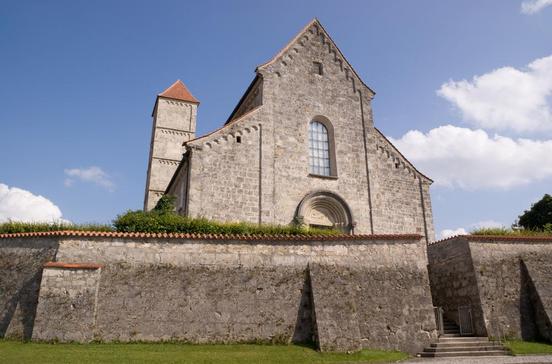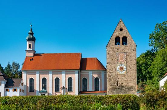 Die bedeutendste romanische Kirche Oberbayerns wurde 1180-1200 als dreischiffige Basilika mit mächtigen Osttürmen aus Tuffstein erbaut. Auf dem Lettnerbalken steht das kostbarste Ausstattungsstück: ein romanisches Kruzifix, der "Große Gott von Altenstadt", zu seinen Seiten Maria und Johannes.