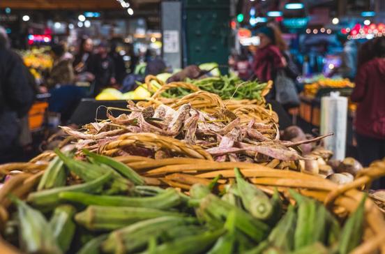 Markt mit Essbuden jeder Nationalität und sogar einem Biergarten.