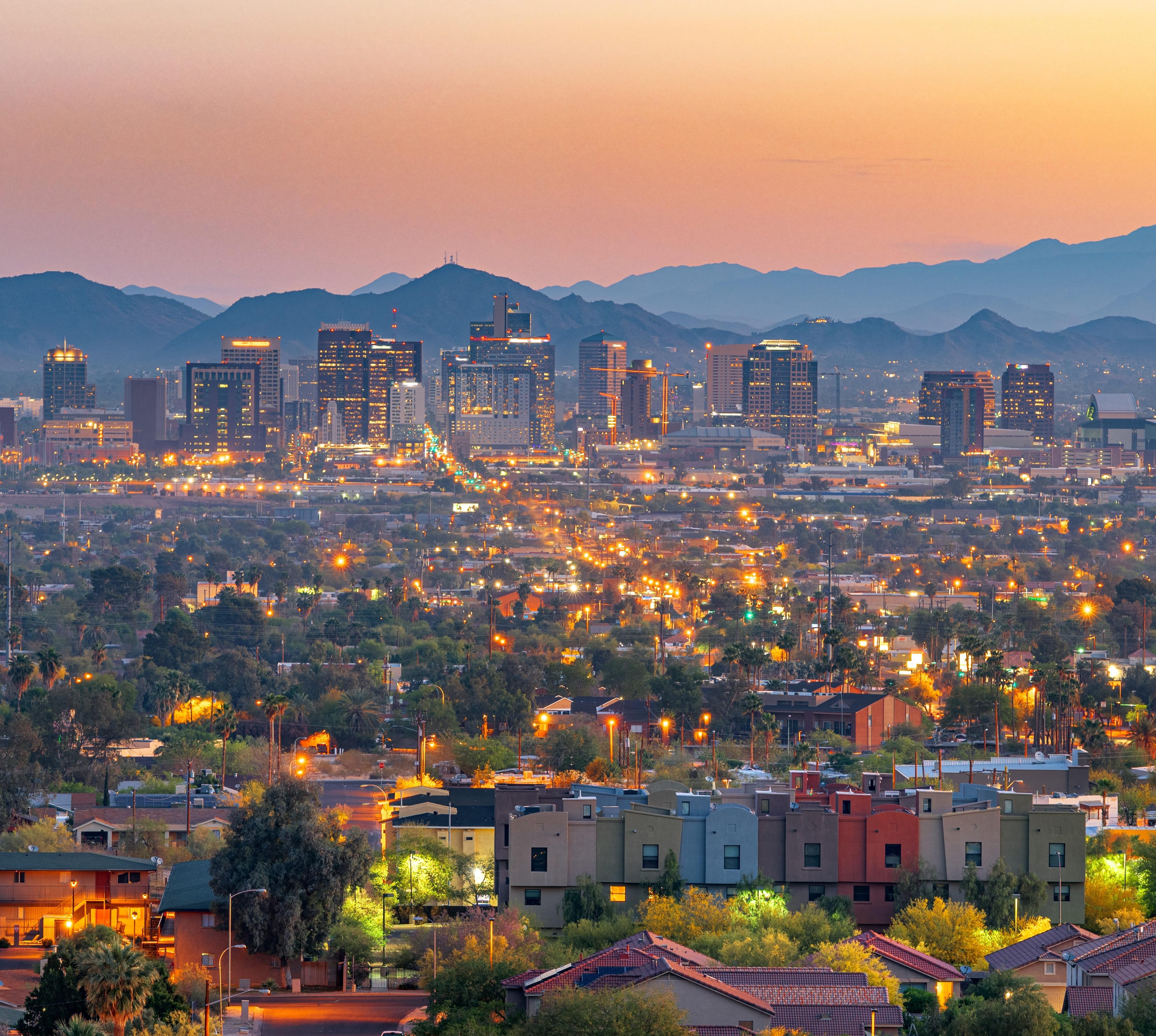 Die stolze Skyline mit ihren spiegelnden Hochhäusern verrät schon von Weitem: Man nähert sich der Metropole und Hauptstadt Arizonas.