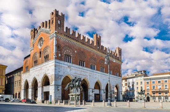 Den Hauptplatz Piacenzas beherrscht der Palazzo Gotico. Mit seinem Arkadensockel aus Marmor und seinem Obergeschoss aus Ziegelstein, mit aufwendigen gotischen Bogenfenstern und Terrakottaverzierungen ist er einer der eindrucksvollsten Bürgerratspaläste Norditaliens aus der Zeit der mittelalterlichen Kommunen. Ebenso berühmt sind die beiden stolzen, vitalen Reiterstandbilder (1620-1625) von Francesco Mochi, die zwei Farnese-Fürsten darstellen.