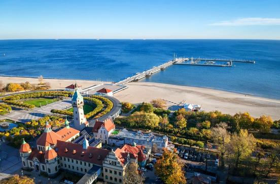 Sopot hat den Glanz eines mondänen Kurorts zurückerobert. Toll ist der weiße, feinsandige Strand, an dem du kilometerweit laufen kannst: Gen Norden kommst du nach 3 km zu den Adlerklippen (Orłowo), die senkrecht aus dem Meer ragen. Doch auch im Ort ist viel zu sehen: in der Nähe der Mole z.B. das Kurhaus (Dom Zdrojowy) mit Touristinfo und Trinkbrunnen, wo du kostenlos Heilwasser probieren kannst. Hier befinden sich auch die Staatliche Kunstgalerie und mit Mineralwasser gefüllte Badepools. Die Mole ist mit 516 m die längste hölzerne Seebrücke Europas. Von hier starten Ausflugsschiffe nach Danzig und auf die Halbinsel Hela. Von der Mole gelangt man über die Promenade (Bohaterów Monte Cassino) in die Stadt. Die Fußgängerzone mit Galerien und Cafés ist meist gut besucht. Abseits vom Trubel bietet das Strandhotel Marriott Sopot in skandinavischem Ambiente Wellness vom Feinsten. Das Haus liegt am Strand, die Architektur sorgt mit Holz und Naturstein für Entspannung.