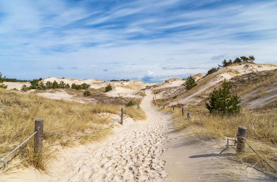 Fast 35 km zieht sich der Nationalpark an der Ostsee entlang – 180 km2 wildromantische Küstennatur, ein Mosaik aus Sandheiden und würzig duftendem Kiefernwald, einsamen Stränden, Erlenbrüchen und zahllosen sumpfigen Seen, die wie die Lagunen Gardno und Łebsko einst Buchten der Ostsee waren. Zentrum des Parks sind die berühmten Wanderdünen. Vor 800 Jahren holzten die Menschen hier den Eichenwald ab, der auf dem jungen Landstrich zwischen Küste und Lagunenseen wuchs. Der vom Wind herangewehte Meeressand türmt sich zu hohen Dünen, die immer weiter landeinwärts wandern und im Lauf der Zeit ganze Dörfer unter sich begruben. Sehenswert ist außer der Natur vor allem Kluki am Westufer des Łebsko-Sees mit reetgedeckten Häusern in Blumengärten, Speichern und Bootslagern – heute ein Freilichtmuseum. Hauptort ist Łeba, ein vitales Fischerstädtchen mit Yachthafen, Restaurants, Cafés und perlweißen Stränden. Hotels und Pensionen sind im Sommer allerdings meist überfüllt.