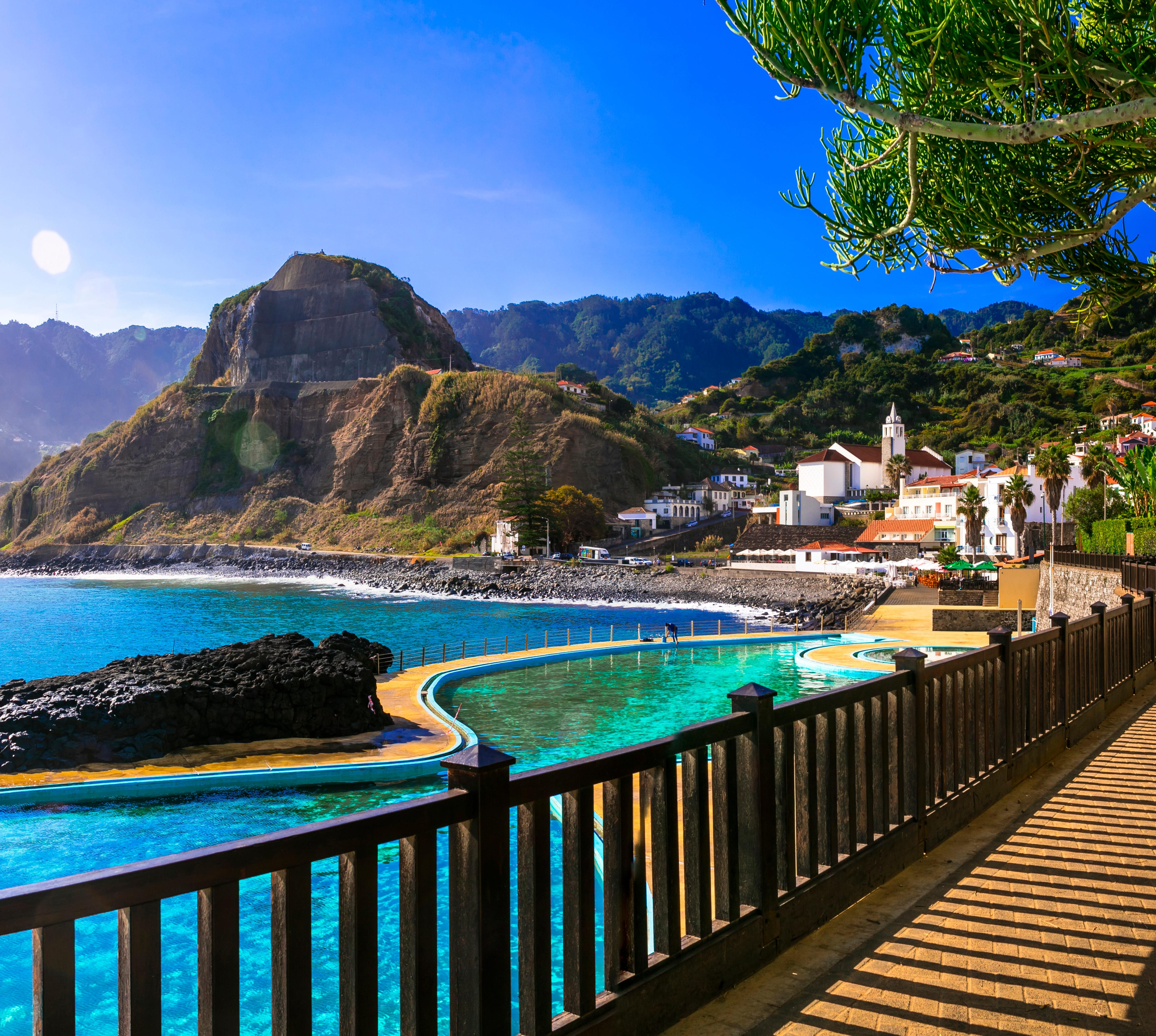 Verzichte auf die Tunnelstrecke nach Faial und nimm die alte Bergstraße – hinter jeder Kurve eröffnet sich ein neues Panorama. Umgeben von Rebterrassen und Obstgärten ruht das anmutige 1300-Seelen-Dorf am Hang, den Blick fest auf den fast 600 m hohen Küstenberg nebenan gerichtet – den Penha de Águia („Adlerfels“). Eine tolle Aussicht auf den Berg hast du vom kleinen Fortim aus, einem Miradouro mit ein paar übrig gebliebenen Kanonen. Etwas mehr los ist an den zwei spektakulären Klippen-Skywalks am Miradouro do Guindaste unterhalb von Faial (Achtung, Insta-Alarm!). Für kleine Speedy Gonzales ist die Kartrennbahn das Richtige. Das k Kartódromo do Faial liegt im Mündungsbereich der Ribeira do Faial und wird von einem Verein betrieben, Gäste sind willkommen. Wenn du lieber baden möchtest, fahr an der Kartbahn vorbei zum „Strand“. Die künstliche Badebucht neben der Flussmündung ist bestens vor der rauen See des Nordens geschützt, im Sommer kann man sein Handtuch auf die Betonliegeflächen legen, und über die Rampe kommt man ins Wasser. Ein Café versorgt dich mit Snacks und Getränken. Wer Lust auf frische Speckforelle in lauschiger Korbmöbelatmosphäre hat, geht in die Casa de Chá do Faial. Von der Dachterrasse des seit Jahrzehnten Touristen und Einheimische beglückenden „Teehauses“ im höher gelegenen Ortsteil São Roque do Faial gibt’s einen grandiosen Rundumblick über die grünen Bergrücken.