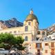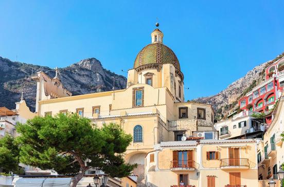 Die schöne Kirche mit Majolikakuppel an der Hauptpiazza besitzt im Innern ein mittelalterliches Marienbild und draußen am Kirchturm ein Relief des Künstlers Mimmo Paladino mit Fischen und Seeungetüm, das Wahrzeichen Positanos.