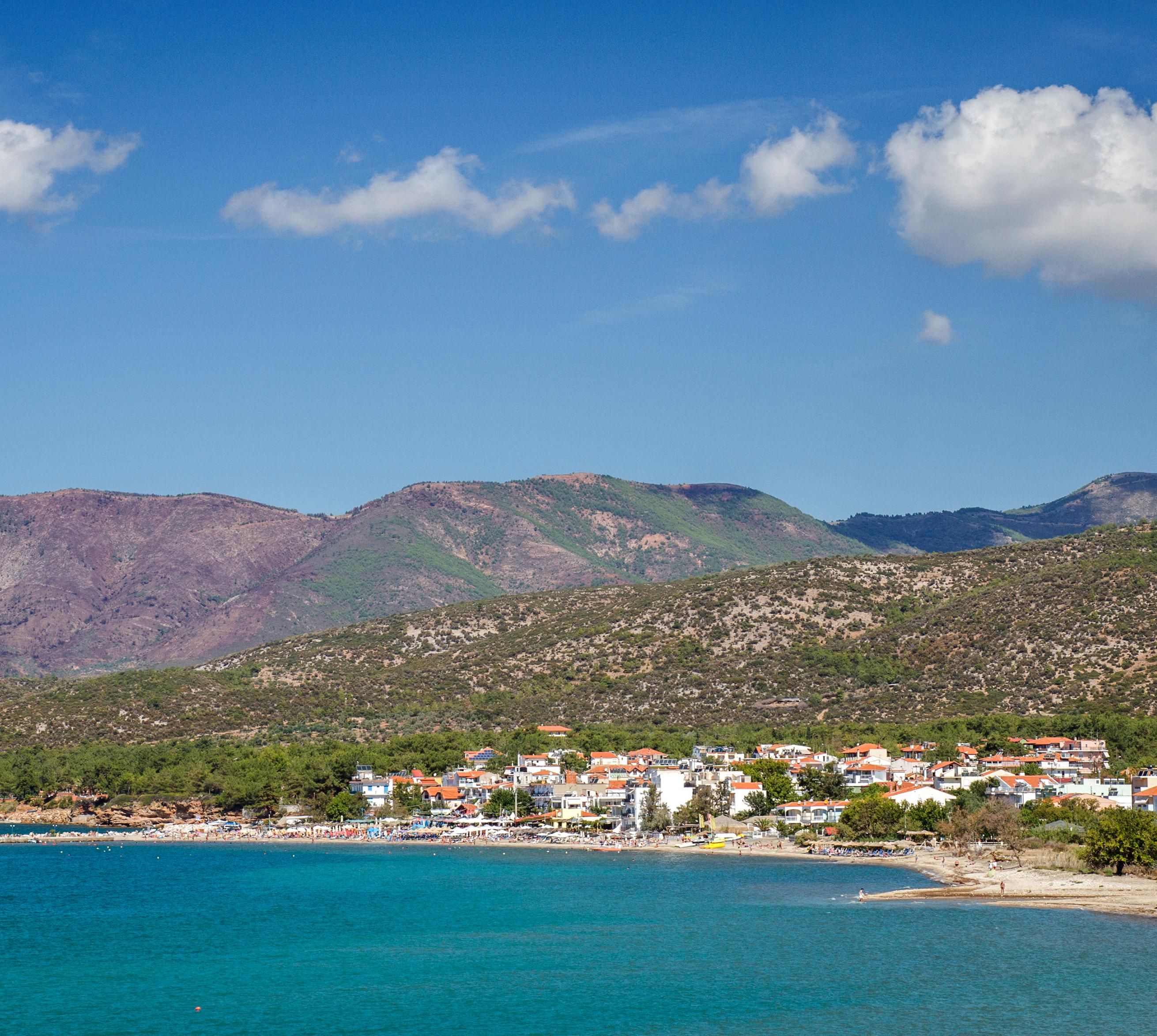 Limenária, der größte Ort im Süden der Insel Thássos, bietet einen Sand-Kies-Strand. Auf einem Hügel über dem Ort kündet die große, als "paláti" bezeichnete Villa aus dem frühen 20.Jh. vom einstigen Wohlstand, der dem bis 1962 hier betriebenen Erzabbau zu verdanken war.