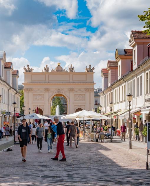 Dass der Industrie der Nachwuchs nicht ausgeht, dafür sorgt die älteste Medienhochschule Deutschlands, 1954 als Deutsche Hochschule für Filmkunst gegründet, heute als Filmuniversität Babelsberg Konrad Wolf bekannt. Hier lernten Andreas Dresen und Bjarne Mädel ihr Handwerk. In Kombination mit vier weiteren Hochschulen und mehr als 40 Forschungseinrichtungen macht sie Potsdam zudem zu einem wichtigen Wissenschaftsstandort. Über 10 000 Wissenschaftler und mehr als 27 000 Studierende konzentrieren sich hier. Letztere wohnen zwar gerne in Berlin und pendeln, die selbst ernannte Studentenstadt sieht darüber aber wohlwollend hinweg. Präsent, und zwar weltweit, sind hingegen die Forscher des Potsdam-Instituts für Klimafolgenforschung, die genau wissen wollen, wie das mit dem Klimawandel läuft. Für ihren Standort, bislang Typ „gemäßigtes Klima der mittleren Breiten“, prophezeien sie höhere Temperaturen und weniger Regen. Schlechte Nachrichten für die Rasen- und Rabatten- Beauftragten von Sanssouci. Wandel an sich kann auch eine gute Sache sein – Kulturwandel bringt Innovatives hervor. Das Areal um die Schiffbauergasse zeigt, dass gelebte Kultur auch Jahrhunderte nach Friedrich II. noch großgeschrieben wird in Potsdam. Wo im frühen 19.Jh. mit viel Dreck und Staub verbunden Dampfschiffe gebaut und bis 1990 Gas für die Stadt produziert wurde, hat sich heute Kultur aller Art etabliert. Im Waschhaus gibt es Partys, Comedy und Konzerte, im T-Werk wird getanzt und Theater gespielt, und auch die Potsdamer Institution Hans-Otto-Theater hat ihre Hauptspielstätte im Kunstund Kulturquartier. Man muss also nicht das große Berlin sein, um alles zu haben, was man zum Wohlfühlen braucht.
