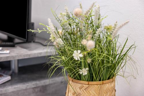 Diese Ferienwohnung hat eine Terrasse, ein Wohnzimmer und einen Flachbild-TV. Die Küche ist ausgestattet mit einem Kühlschrank und einem Geschirrspüler, einem Ofen sowie einer Kaffeemaschine und einem Wasserkocher.