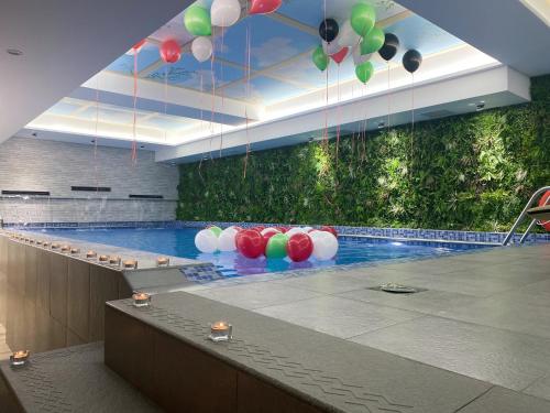 The hotel has a restaurant, a gym, and an indoor pool area with large windows and beautiful views of the city.