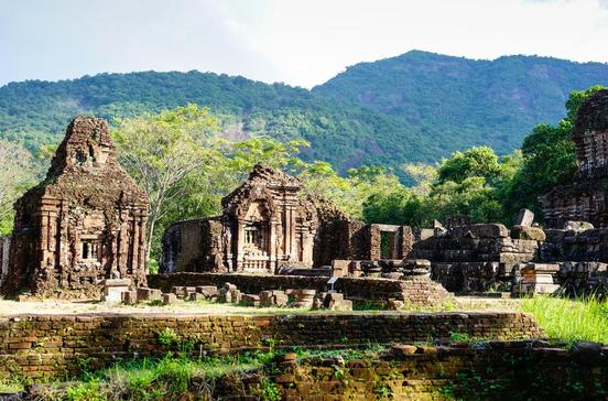 Urplötzlich ragen aus dem dichten Grün des Dschungels die bemoosten, von Farnen umrankten rostroten Tempeltürme von My Son. Vom 4.bis zum 13.Jh. war My Son das bedeutende religiöse und kulturelle Zentrum der Cham. Die Gründung des dem Gott Shiva geweihten Heiligtums wird dem Champa-König Bhadravarman zugeschrieben, dessen Herrschersitz nahe dem heutigen Tra Kieu lag. Seit dem 7.Jh. wurden die ersten, aus Holz errichteten Sakralbauten durch Ziegelbauten ersetzt. Beim Bau wurde weder Mörtel noch Kalk verwendet, das Harz des Cau-Day-Baums hielt die Mauern zusammen. My Son mag für manche Urlauber nur eine Ansammlung von vergessenen Ruinen sein - Türme, Mauern und Tempel, die zudem extrem unter dem Krieg gelitten haben. Nachdem Vietcong das Tal als vermeintlich sicheres Versteck entdeckt hatten, erklärte die US-Armeeführung die Region zur freien Feuerzone. Nur ein Bruchteil der ursprünglich 70 Sakralbauten blieb bei den Bombardements unbeschädigt. Wer aber die Kultur des Champa-Reichs vertiefend studieren möchte, kommt an My Son nicht vorbei. Zu Recht hat die Unesco die Tempelstadt 1999 unter den Schutz des Weltkulturerbes gestellt. Die Cham-Tempel unterhalb des Berges My Son (Schöner Berg) sind in vier Gruppen eingeteilt: Gruppe A zeigt Steinreliefs, Gruppe B ein prächtiges Tor, das sich zum Heiligtum öffnet. In Gruppe C weisen die Ziegelwände überwiegend Cham-Motive auf, und Gruppe D ist ein Ensemble aus sechs Gebäuden und dem sogenannten Stelenhof mit Opfertafeln. Da bis heute unzählige Landminen in der Erde um My Son verborgen sind, sollte man unter keinen Umständen die ausgewiesenen Pfade verlassen.
