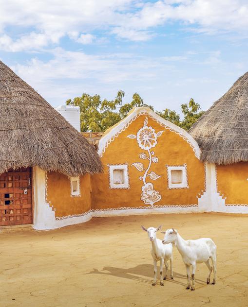 Wenn Sie im Wüstendreieck zwischen Jodhpur, Bikaner und Jaisalmer im Nordwesten unterwegs sind, können Sie gut und gerne zwei, drei Stunden fahren, ohne an einen einzigen größeren Ort zu kommen. Die Wüste Thar umfasst etwa acht Prozent der indischen Gesamtfläche. Im Bundesstaat Rajasthan ist fast die Hälfte des Landes Wüstengebiet. Nur an wenigen Orten allerdings findet man Sanddünen, die an Bilder aus der Sahara erinnern. Dornige Sträucher, die sich vor der Hitze ducken, und vereinzelte Bäume setzen grüne Farbakzente in die staubige, steinige Weite.