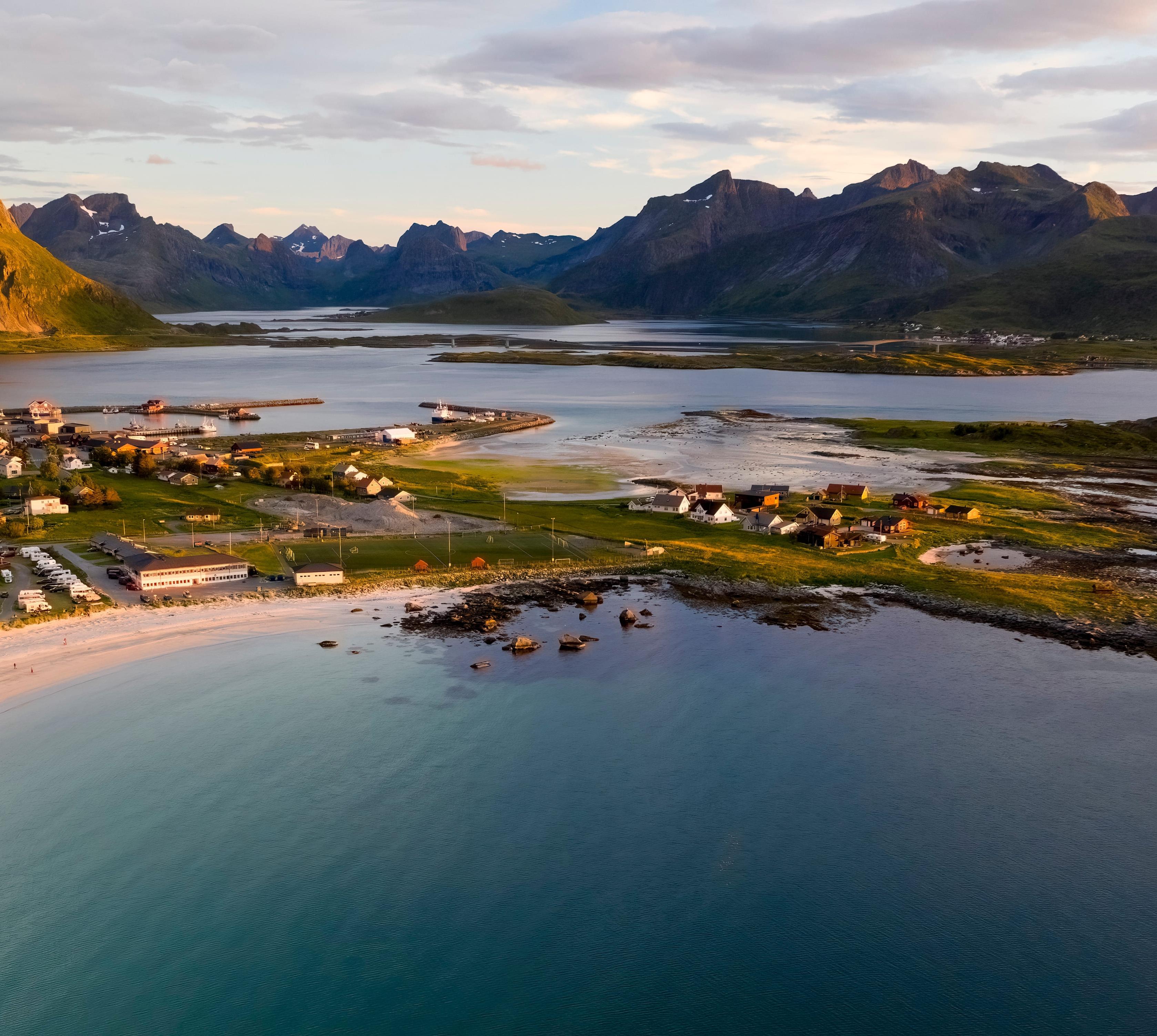 Schräg gegenüber von Ramberg bilden die kühn gemeißelten Berge über Fredvang einen kontrastreichen Hinterrgrund. Zwei fantastisch aussehende Bogenbrücken führen von der E10 aus hinüber zu dieser 6 km von Ramberg entfernten, rund 100 Ew. zählenden Ortschaft.