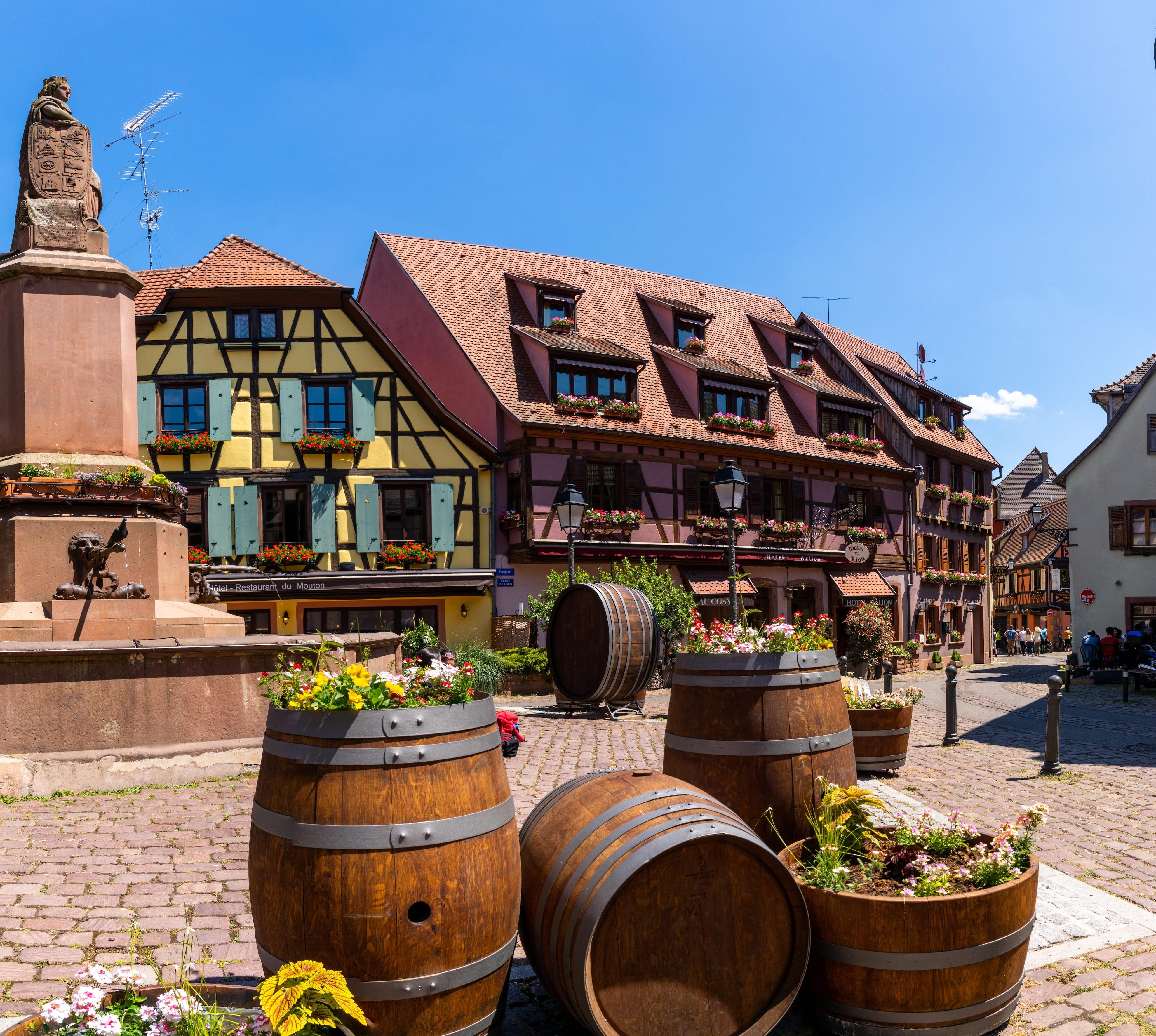 Das Städtchen (4800 Ew.), auf Deutsch Rappoltsweiler, gilt als Gesamtkunstwerk in Sachen Fachwerk und hat mit dem Mittelalterfest Pfifferdaj im September ein Event, das alle Grenzen sprengt. Bei Beauvillé mit Fabrikverkauf bekommst du außergewöhnliche Tischwäsche. Dazu gehört ein kleines Museum zur Geschichte von Beauvillé, in dem es auch jene japanische Stoffbahn zu sehen gibt, die 1900 bei der Weltausstellung in Paris den ersten Preis gewann. Im Zentrum ist das Salon de Thé-Bar-Restaurant Au Marché eine gute Anlaufstelle. Die Distillerie Metté verschnapst Pflaumen und Kirschen, aber auch Tannenspitzen, Knoblauch und sogar Spargel. Topwellness bietet dir das Spa im Resort Barrière mit Bar, Terrasse und Park. Während du dich vom Wasserstrom treiben lässt, schaust du auf die blaue Linie der Vogesen. Im Untergeschoss gibts Sauna und Hamam, in der Dusche wächst ein kleiner Eisberg.