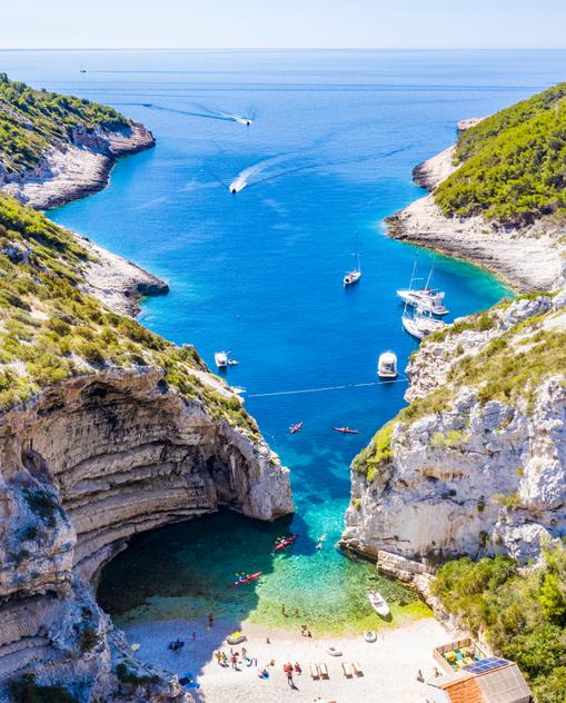 Wanderer und Kletterer können an einem Tag den alpinen Raum erobern und gleich im Anschluss den maritimen mit einem Sprung ins kühle Nass. Diese kontrastreiche Küste wählte der römische Kaiser Diokletian zum Altersruhesitz und vermachte der Nachwelt einen Palast, der die Keimzelle für das quirlige Split bildete. Heute ist die Stadt die zweitgrößte Kroatiens und bietet Großstadtflair, ein reges Nachtleben sowie einen ganz eigenen lokalen Charme. Ihre Schwester Trogir ist von historischen Renaissancebauten geprägt, während die Region rund um Makarska mit feinen Kies- und Sandstränden punktet. Die Inselwelt vor der Küste ist mindestens so berühmt – allen voran die High-Society-Partyinsel Hvar, für Aktivurlauber auch das Windsurfparadies Brač.