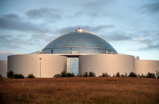 Eine Mischung aus Pragmatismus und Futurismus ist dieses Wahrzeichen Reykjavíks, die verspiegelte Glaskuppel auf sechs Heißwassertanks auf dem Gipfel des bewaldeten Hügels Öskjuhlíð. Der Innenraum bietet Platz für Empfänge und kleinere Messen und in einem der Tanks ist ein Geschichtsmuseum untergebracht. Ein Springbrunnen schießt alle 15 Minuten - ähnlich wie der Geysir Strókkur - eine Wasserfontäne in die Höhe. Auf den Tanks wurde eine Aussichtsplattform installiert, die rund um die Kuppel führt und von der man bis zum Vulkankegel Snæfellsjökull blicken kann. Fünf Minuten entfernt befindet sich ein künstlicher Geysir mit Erklärung seiner Funktionsweise.