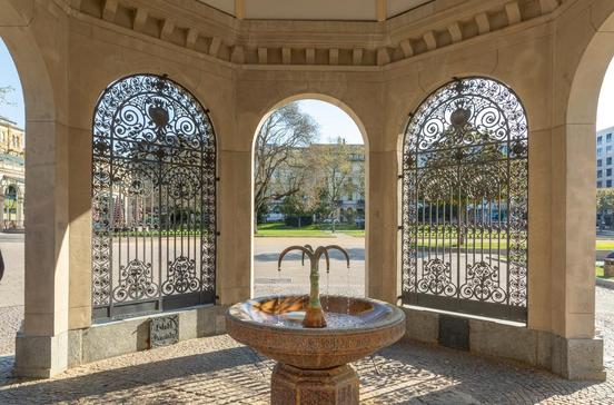 15 zusammengefasste Quellen speisen das 69 Grad heiße Wasser, das hier täglich aus der Erde sprudelt. Die Quellen sind ergiebig: Pro Minute fließen 880 l Wasser. In der 1890 eingeweihten Brunnenhalle können Besucher einen Schluck des salzhaltigen Wassers probieren.
