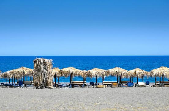 Der Kiesstrand Afántou Beach ist zwar kilometerlang, landschaftlich aber eher unattraktiv und außerdem völlig schattenlos. Ein Minizug auf Rädern fährt tagsüber einmal in der Stunde vom Dorf zum Strand.
