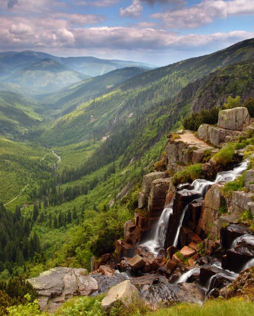 Zwei Länder teilen sich das Riesengebirge, eines der kleinsten in Europa, das sich bis zur 1602 m hohen Schneekoppe auftürmt; der nördliche Teil gehört zu Polen, der südliche zu Tschechien. Der Name übertreibt jedoch gewaltig: Das Riesengebirge hat nur eine Länge von etwa 40 km, in der Breite kommt es wenig über 20 km. Somit ist es bedeutend kleiner als vergleichbare Gebirge, in der Höhe rangiert es aber in Mitteleuropa nach den Alpen an zweiter Stelle. Der Name des Gebirges hat keinen Größenbezug, er soll auf den Begriff „Riesen“ zurückgehen, wie in Süddeutschland und Österreich im Gebirge die Rutschen genannt wurden, mit denen Holz ins Tal befördert wurde.