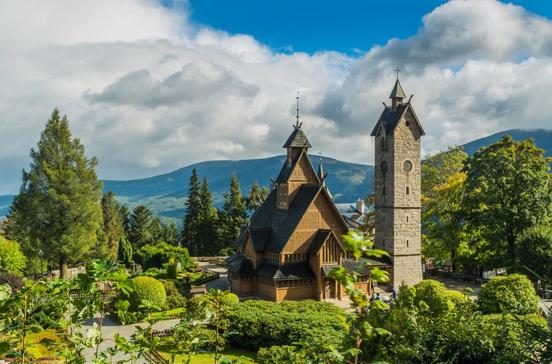 Das Gotteshaus oberhalb von Karpacz im Ortsteil Bierutowice ist das bekannteste Baudenkmal im schlesischen Riesengebirge, ein bezauberndes Zeugnis skandinavischer Holzbaukunst im romanischen Stil. Der preußische König reiste 1844 höchstpersönlich nach Brückenberg (heute ein Ortsteil von Karpacz), um an der Weihung der Kirche teilzunehmen. Der Landschaftsmaler Jan Christian Dahl, ein Schüler Caspar David Friedrichs, erwarb 1841 diese in Norwegen zum Abbruch bestimmte Stabkirche (das tragende Gerüst besteht aus Stäben) im Auftrag von Preußenkönig Friedrich Wilhelm IV. Wäre es nach dem Monarchen gegangen, würde das Kleinod aus dem frühen 13.Jh. heute auf der Berliner Pfaueninsel stehen. Gräfin Friederike von Reden jedoch konnte den König überreden, das Kirchlein im Riesengebirge aufstellen zu lassen. Zum Dank dafür wurde der Gräfin schräg gegenüber dem Kircheneingang ein Denkmal (1856) gesetzt. Besonders wertvoll an der Kirche Wang sind die Schnitzereien an den Kapitellen und Portalen; der massive, 24 m hohe Glockenturm ist eine etwas spätere Zugabe, er entstand auf Wunsch des Preußenkönigs nach einem Entwurf des Schinkelschülers Friedrich August Stüler.